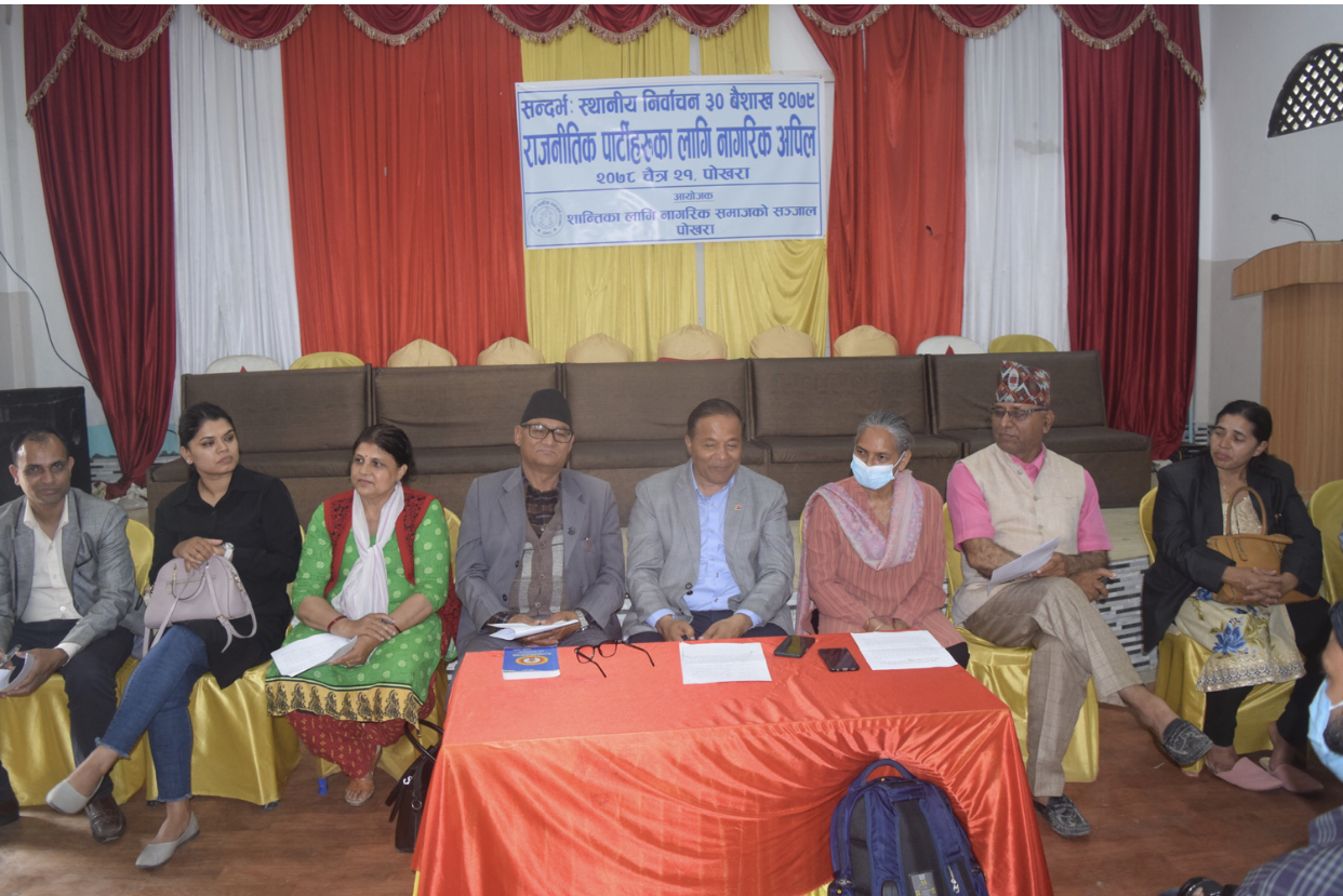 अनौपचारिक क्षेत्र सेवा केन्द्र इन्सेक गण्डकीका संयोजक शिव खकुरेलले निर्वाचनलाई स्वच्छ,निष्पक्ष र धाँधली रहित बनाउन नेपाली कांग्रेस र नेकपा एमालेको पार्टी कार्यालयमा नागरिक अपिल बुझाइसकिएको र अन्य दलहरुलाई पनि बुझाइने जानकारी दिनुभयो ।