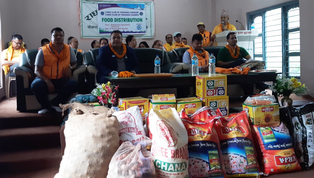 शनिबार बृद्धाश्रममा आयोजित एक कार्यक्रमका बीच प्रमुख अतिथि लायन्स डिष्ट्रिक्ट ३२५ एम का चिफ डिष्ट्रिक्ट एडभाइजर धनीराम बराल, लायन्स क्लब अफ पोखरा लेकसाइडका अध्यक्ष कृष्णकुमार श्रेष्ठ, कार्यक्रम संयोजक जयराम तिमल्सिना, लायन्स क्लब अफ पोखरा गार्डेनका अध्यक्ष राम कंडेलले संयुक्त रुपमा बृद्धाश्रम सञ्चालक समितिका अध्यक्ष प्रेम लिगललाई खाद्यान्न हस्तान्तरण गरेका थिए ।