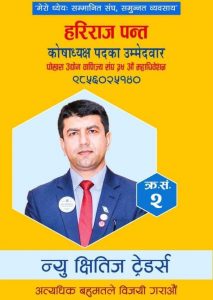कोषाध्यक्ष तर्फका उम्मेद्वार हरिराज पन्तले संघ सबै उद्योगी व्यवसायीको अभिभावक संस्थाका रुपमा स्थापित गर्ने बताए । लगानीका हिसावले सानो ठूलो भन्दैनौं । सबैलाई सम्मान गर्छौं । संघको आर्थिक अवस्था सुधार्न मेहनत गर्छौं,’ उनले भने ।