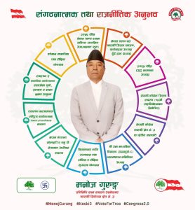 पोखरा । कास्की जिल्ला अन्तर्गतको निर्वाचन क्षेत्र नं. ३ मा यसपटकको राजनीतिक प्रतिस्पर्धा विशेष चासोको विषय बनेको छ। आगामी निर्वाचनलाई लक्षित गर्दै नेपाली कांग्रेसका उम्मेदवार मनोज गुरुङले संगठनात्मक अनुभव र समाजसेवाको दीर्घ यात्रालाई विकासको स्पष्ट खाकासँग जोड्दै अघि सारेका छन्।