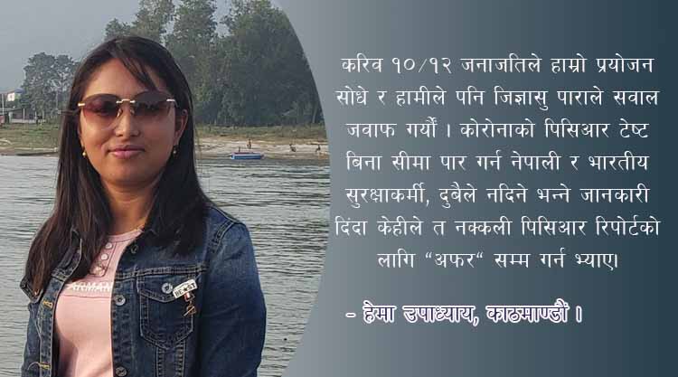 हामी फर्किएर बसपार्कछेऊमा पुग्दा नपुग्दै करिब आधा दर्जन मान्छे (बिचौलिया) ले चाहिएमा जस्तोसुकै पिसिआर वा एण्टिजेन टेष्ट रिपोर्ट (जाँचै नगरी) तुरुन्तै बनाईदिने, पारीपट्टीपनि सजिलै पुर्याईदिने वा पारीवाट आएकाहरूका लागि नेपालको कुनैपनि ठाँउमा सजिलै पुर्याईदिने धेरै “अफरहरू” गरे ।